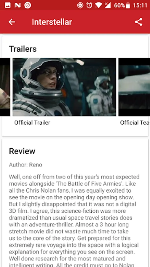 Explore trending and highest rated movies. Movies can be saved for future viewing which will be displayed in the favourite tab. The trailers can be shared with your contacts using the share button.