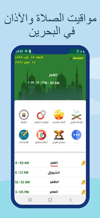 Prayer times and Azan in Bahrain is one of the best Islamic applications for mobile phones, as it contains everything a Muslim needs, starting from prayer times and Azan, reading and listening to the Noble Qur’an to morning and evening remembrances, Qibla direction and Hijri date...