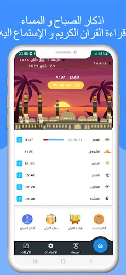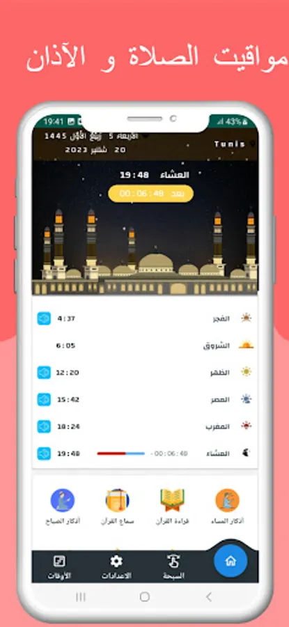 “Prayer times in Tunisia” is a simple application that contains many features and characteristics, including accurate prayer times, morning and evening remembrances, listening and reading the Holy Quran, Hijri date, Qibla, Hajj, fasting...