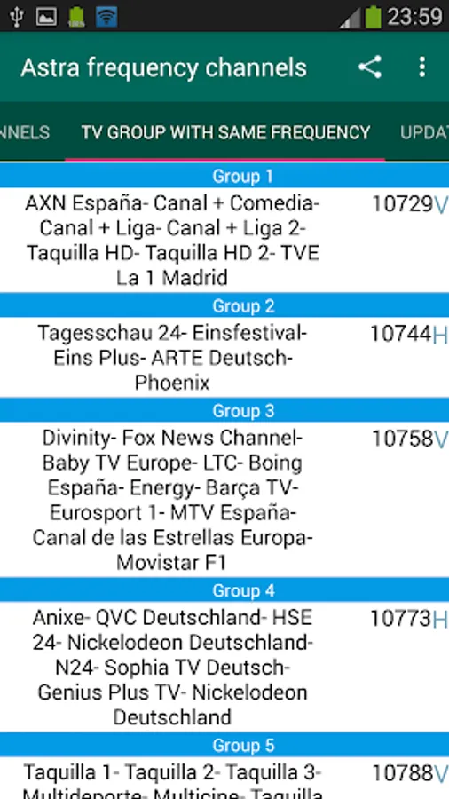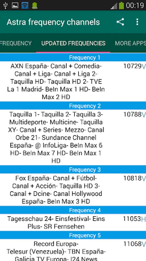 The "Astra Frequency Channels" gives you detailed information about the old and the updated frequencies in 2019 for all TV and Radio channels on the orbit 19.2° E.