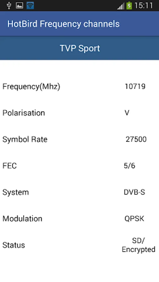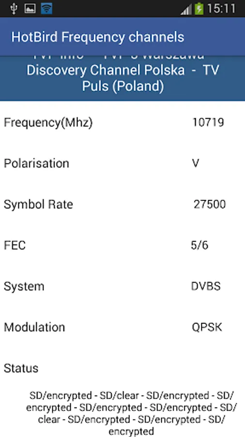 • Detailed information for each channel (frequency - Polarization - SR -FEC -Modulation -System - Channel Status (SD or HD / encrypted or Clear).)