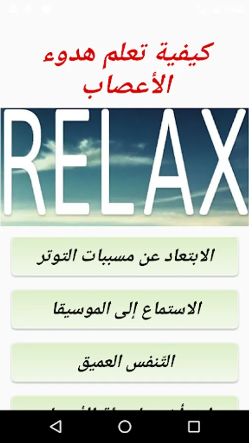 When facing any of the situations that cause nerves tension and strain, the nerves can be controlled, and try to calm them by stopping doing the thing that occupies the mind for a minute, and start pulling five deep breaths and then taking them out, where the abdomen must be swollen with each inhale, then imagine what causes pressure Stress with each exhalation, drawing a smile on the face even if it is fake, and repeating this strategy every few hours while at home, at work, or when needed, and through this application we will talk about ways to calm nerves.