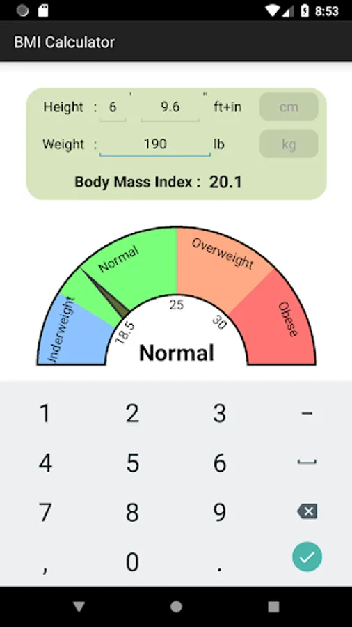 Free and fast Body Mass Index (BMI) calculator App to show real-time result. This App supports metric and feet+inch length units. You can use kilograms and pounds(lbs) weight units.