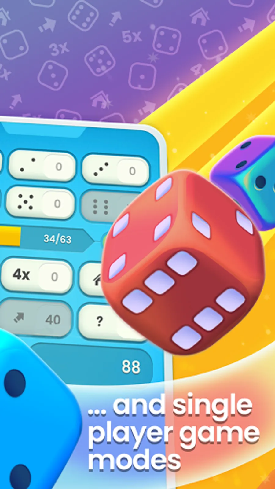 DICE DARTS. This fresh, exciting single-player mode can also be played without time pressure. Your goal is to make it from 501 points to 0 in ten turns. Scoring a category decreases that amount from your total score. Take advantage of score multipliers but remember, going below 0 points gets you back to 50 points. Get to zero with “darts” left to win big!
