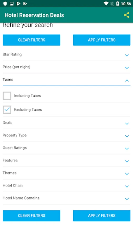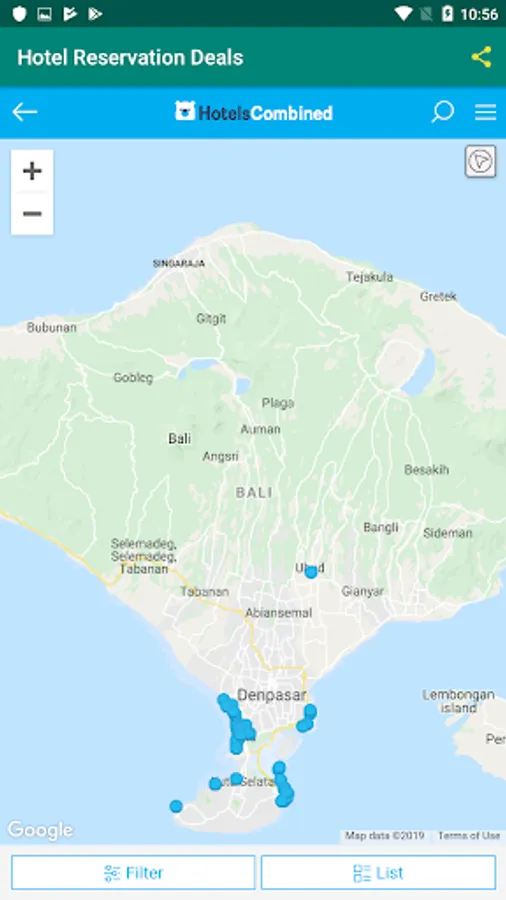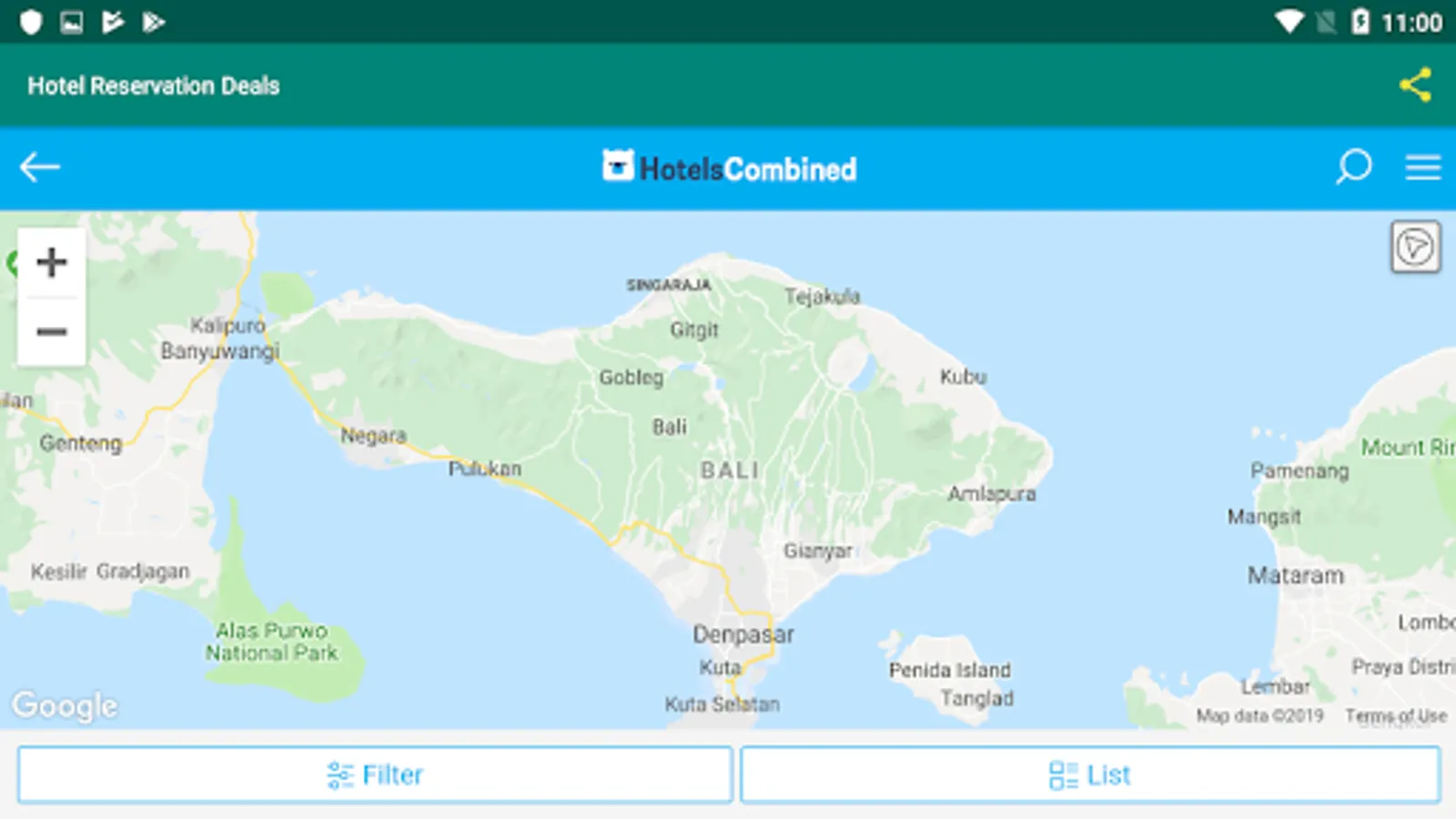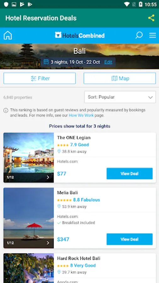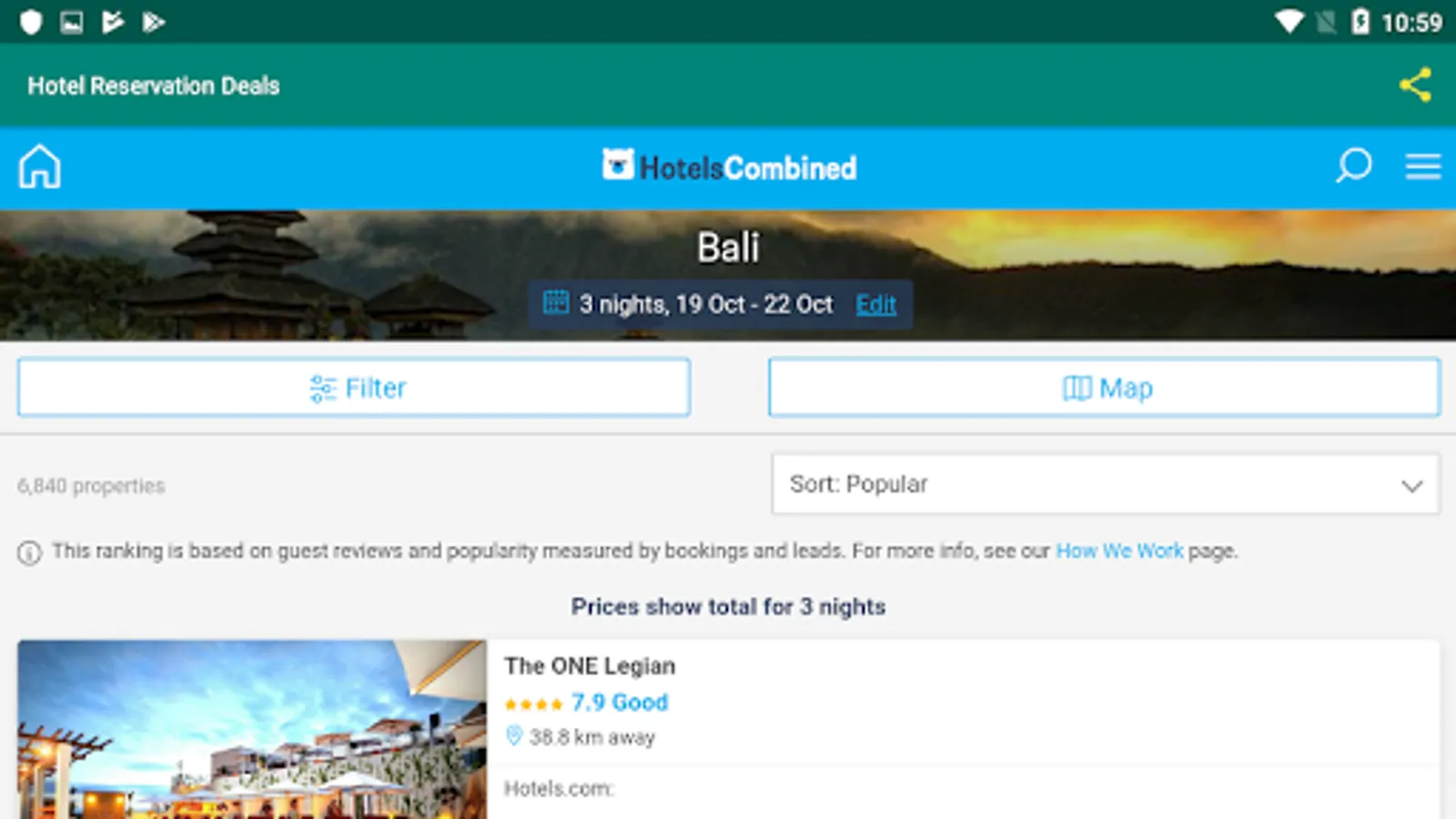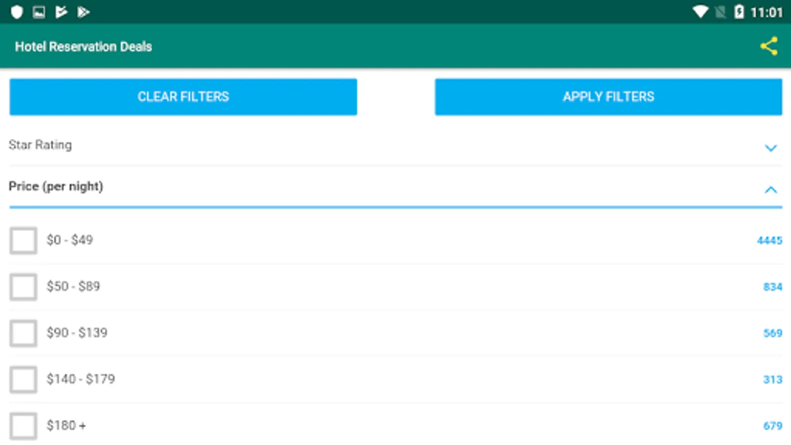 • Interactive map with zoom in, out and slide to reveal more surrounding hotels at or near your destination, which can also serve as a map or city guide for places of interest.