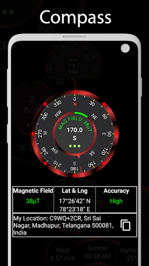 Compass 360 Pro combined with many other modern technical features like Compass, Speedometer, Weather.