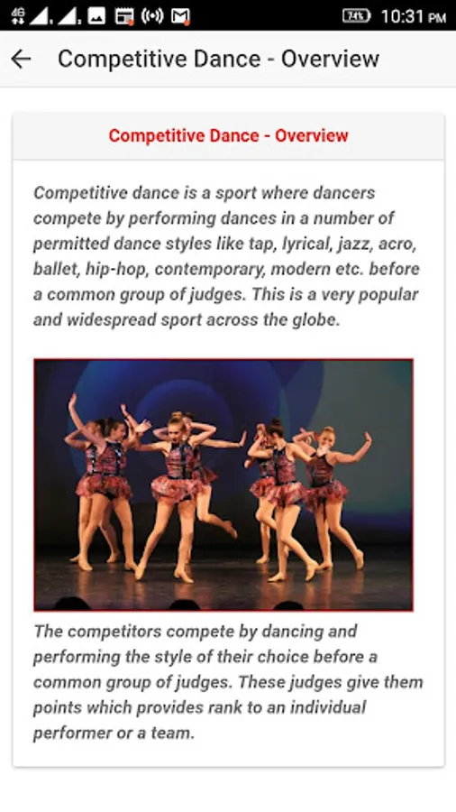 Competitive dance is a sport where dancers compete by performing dances in a number of permitted dance styles like tap, lyrical, jazz, acro, ballet, hip-hop, contemporary, modern etc. before a common group of judges. In this tutorial, we will discuss about dancing in the competitive perspective, its various competitions, awards, judging, etc.