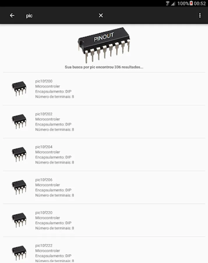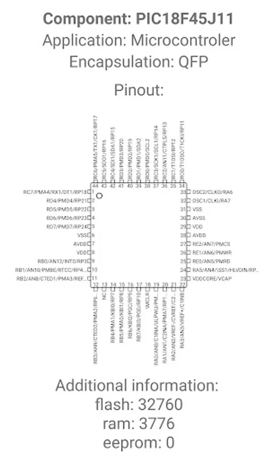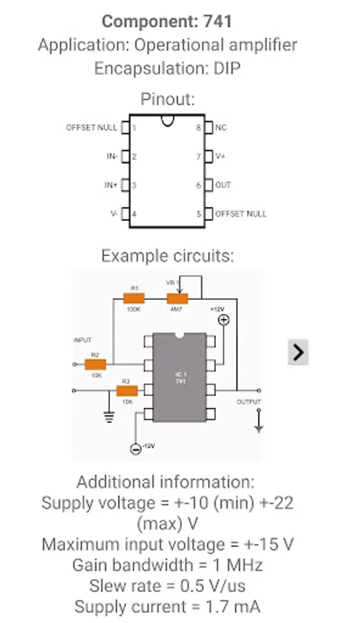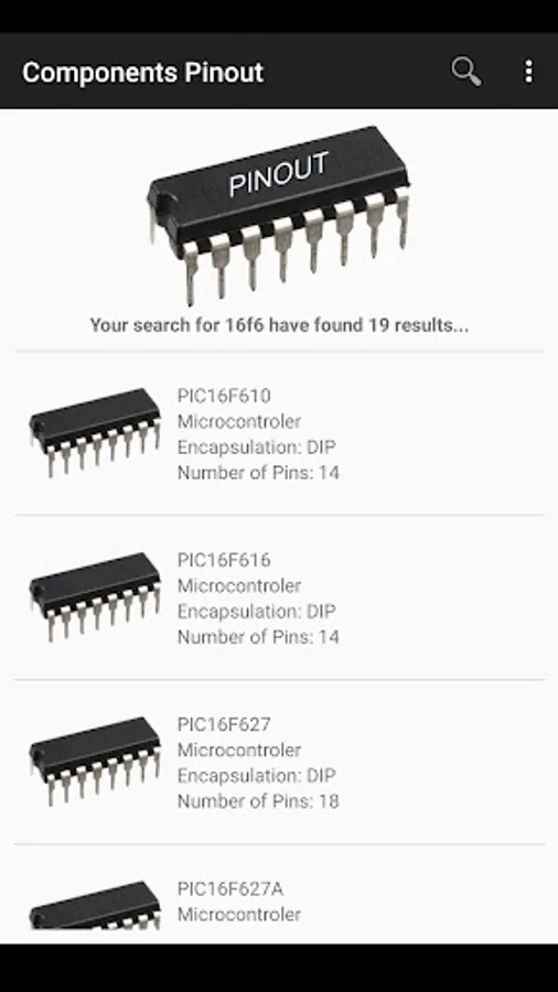 This application provides an offline database with more than 80000 electronic component pinouts. Chips, Transistors, Diodes, Triacs, Microprocessors, and much more.