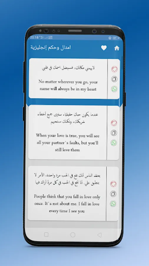 English proverbs and wisdom about love translated into Arabic and English, as you can easily copy the saying or saying for use in the case of WhatsApp or the story of WhatsApp cases or on Facebook, and the application also enables you to share the rule with your friends on social networking sites (WhatsApp, Facebook, Instagram) easily.