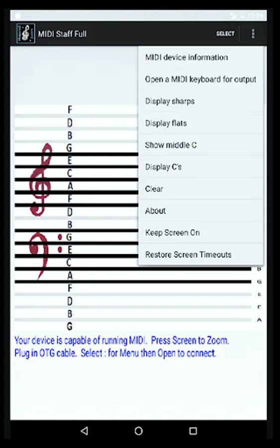 This app displays keys, as they are played, on a musical stave. It also displays the letter of the pressed key. This app is intended to provide an enjoyable way to learn how to read sheet music. These kinds of musical aids have been available on desktop and laptop computers. This app runs on a tablet. The tablet can be sit in an instrument’s sheet holder. There are a lot of musical apps out there but only a few that accept a live MIDI input. I play by ear and I have been looking for something like this for a long time. The app can be set to block out octaves at the C’s. This provides a feel for the keyboard and the musical stave. The app can be set to display flats or sharps. It also has a screen saver inhibit option. It's zoomable. This version does not record anything.