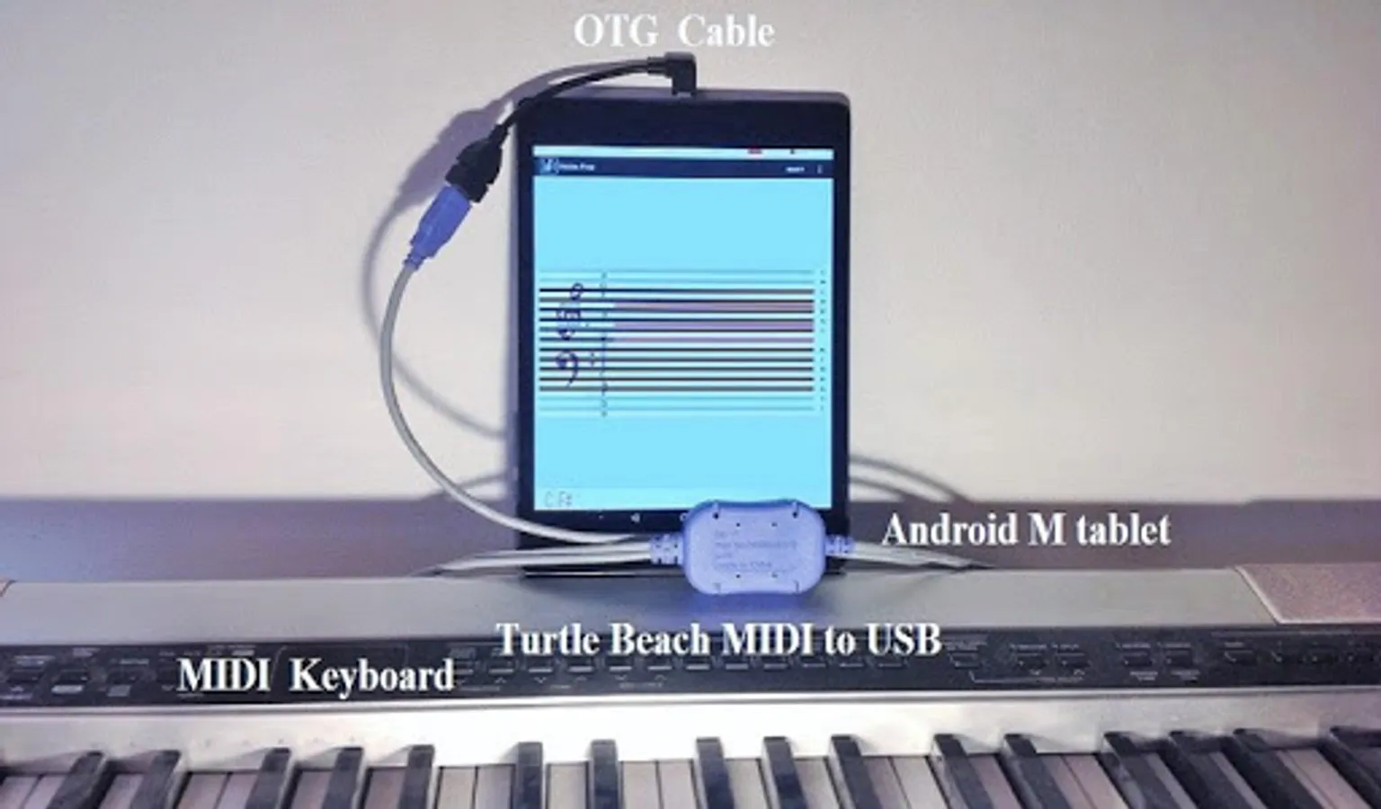The app requires Android M (Marshmallow) or higher. The MIDI musical instrument is connected to the Android tablet with an OTG cable. On newer tablets with a USB type C connector the MOGOOD connection and charging cable works well. On settable keyboards, the MIDI channel should be set to default (0). The app is compatible with many MIDI adapters. The Turtle Beach adaptor works well on both the existing 5 volt and the newer 3.2 volt MIDI systems. The Fasgear adapter also works and it draws its power from the tablet not the MIDI device. Both devices connect to the MOGOOD data and charging cable. I would appreciate if users would post their experience with their tablets, adapters, and keyboards. This will help to resolve compatibility issues with future users, thanks.