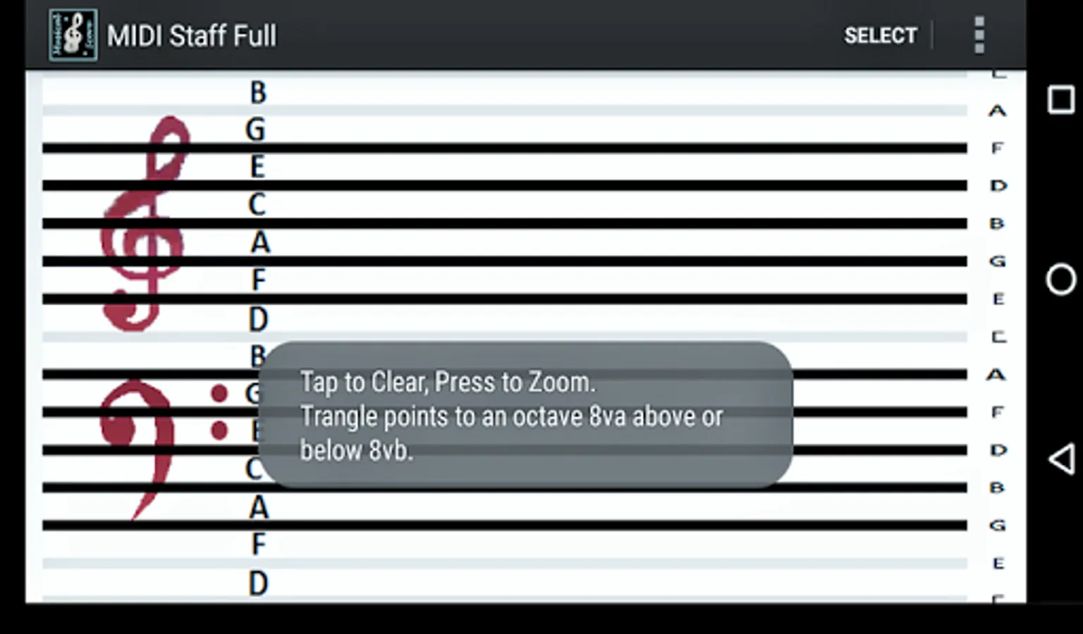 This is a one octave free version of MIDI Staff. It displays the first octave above middle C.