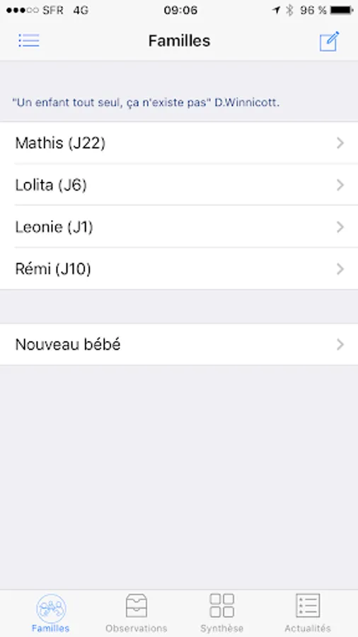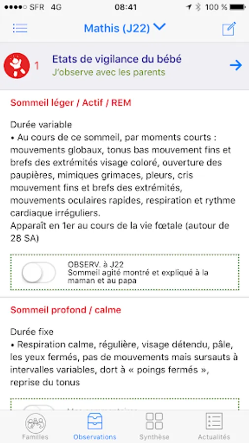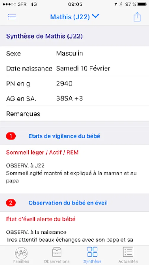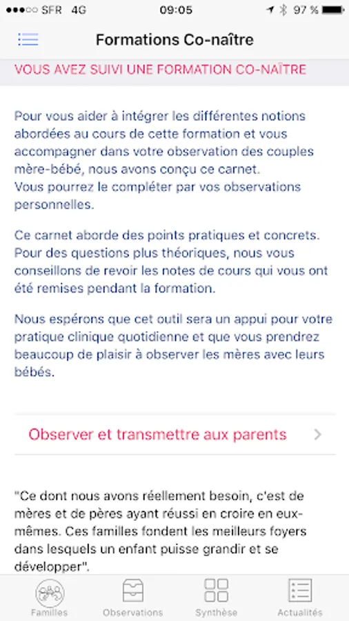 This application does not collect any personal data on its users or observations recorded therein. Thus no data can be transmitted to the Co-naître® training or a third party from the application. It contains no advertising, and no commercial link. It is reserved for use by the health professional who has followed all of a Co-born ® training.