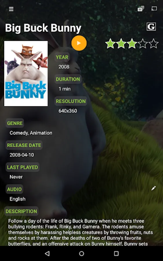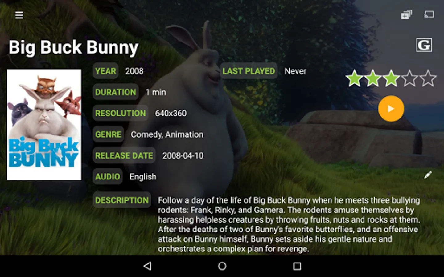 • Full details displayed for movies and TV shows, including title, poster, backdrop, plot, tagline, content rating, user rating, actors, directors, writers, producers, production company (when using with Mezzmo media server).