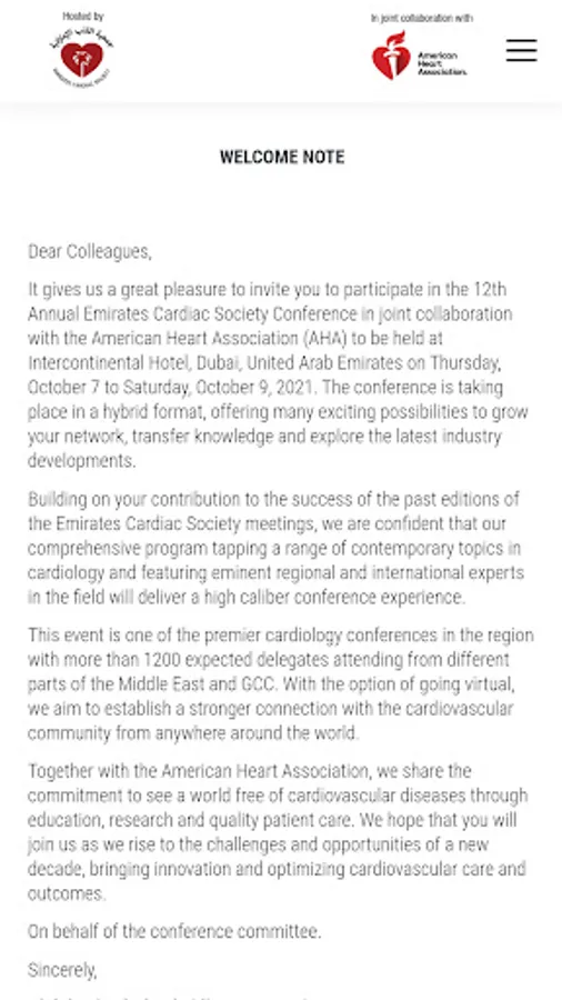 It gives us a great pleasure to invite you to participate in the 12th Annual Emirates Cardiac Society Conference in joint collaboration with the American Heart Association (AHA) to be held at Intercontinental Hotel, Dubai, United Arab Emirates on Thursday, October 7 to Saturday, October 9, 2021. The conference is taking place in a hybrid format, offering many exciting possibilities to grow your network, transfer knowledge and explore the latest industry developments.