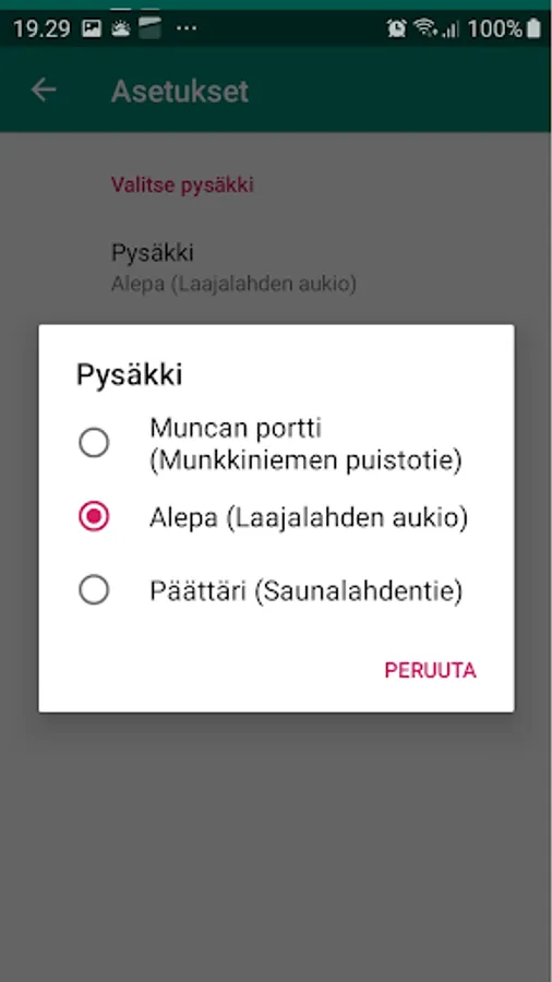 In the application you can choose from four different stops: "Päättäri", "Kadettikoulu", "Alepa" and "Munkkiniemi portti". The data in the application comes from the open interface of HSL, so it basically shows the arrival time of the tram in full real time (at least next to the stop).