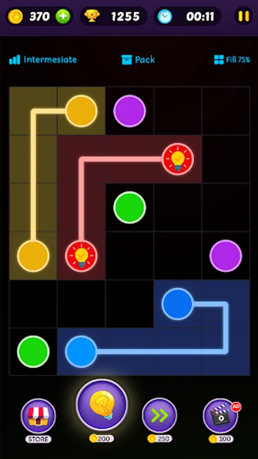 Utilize hints and power-ups to overcome obstacles in the matching color dots connect game.
