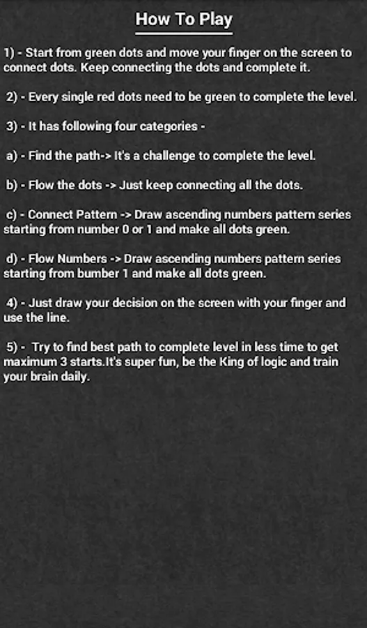 * Start from green dots and move your finger on the screen to connect dots. Keep