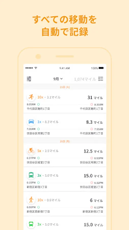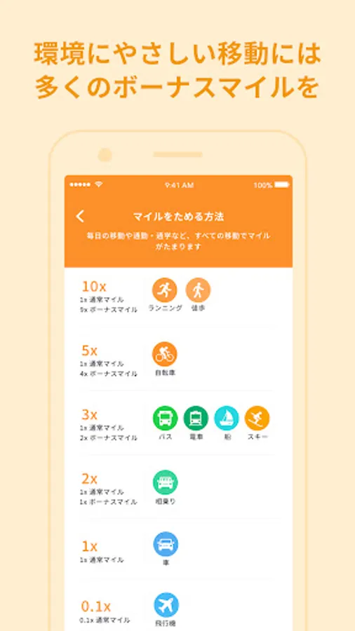 If you install the app and set "always allow" access to location information, you will automatically earn miles according to the distance traveled without having to launch the app each time. You can earn 1 mile of points for every 1 mile (approximately 1.6 kilometers) traveled. AI (artificial intelligence) automatically determines the mode of transportation, and more bonus miles are awarded for eco-friendly transportation. The multiplier for bonus miles set for each mode of transportation is as follows.