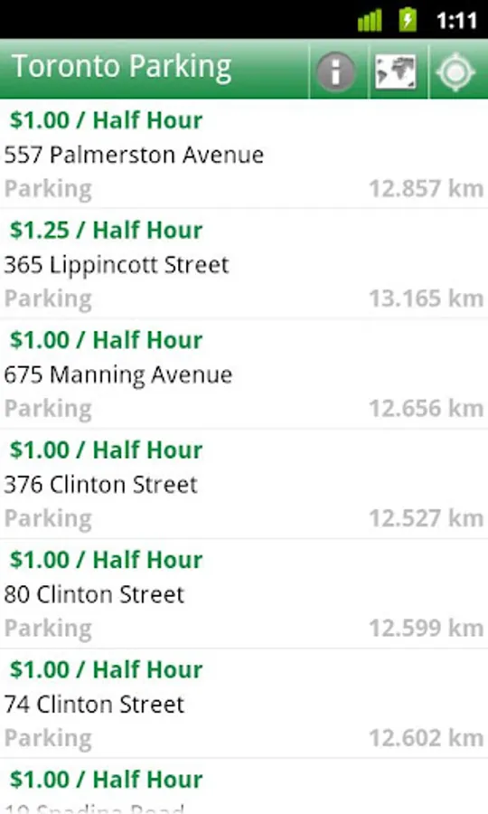With this app, you can find the nearest GreenP parking (Toronto Parking authority) and save even when you don't have a data connection! Directions, Google maps, parking rates, StreetView so you know how the area looks like before you get there.