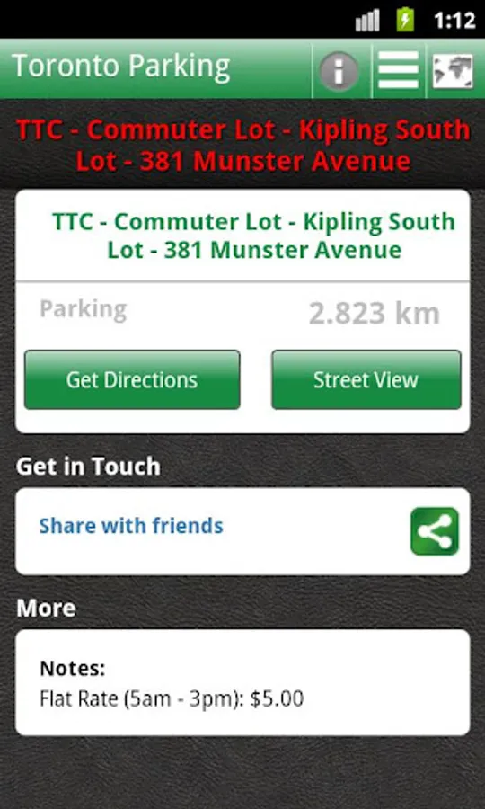 The app also works in offline mode when you don't have a data connection, so you can quickly find the nearest parking lot even when you don't have reception(if you are a visitor to Toronto), but keep in mind that in offline mode StreetView and Directions are not available, the map is also limited to whatever tiles cached on your phone.