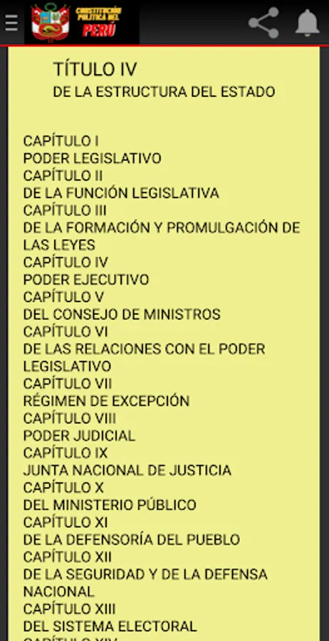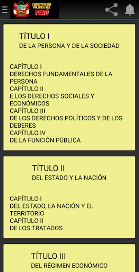 The application has an intuitive interface that will allow you to quickly access the complete Constitution, with its respective structure organized into titles, chapters, and sections.