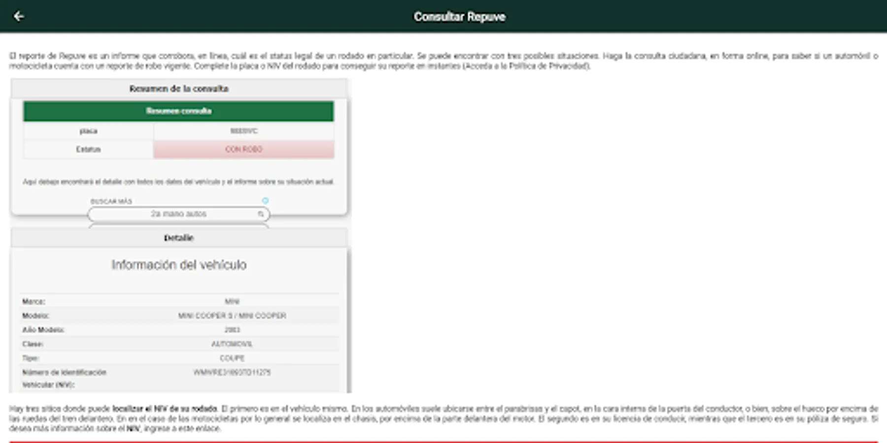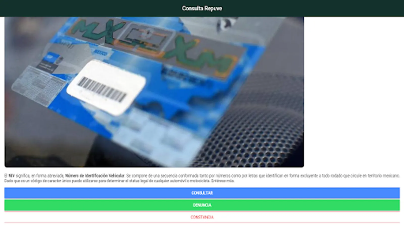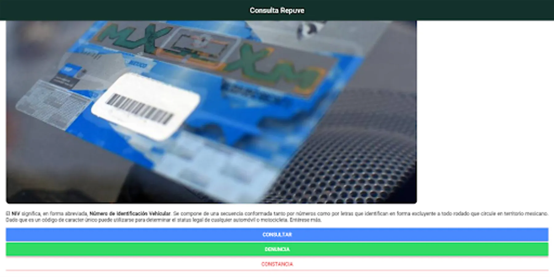 Disclaimer: This application has no relationship with any governmental entity of Mexico or with the Mexican state. The information provided in it is publicly accessible and can be found on the official website of: https://www.gob.mx/sesnsp/acciones-y-programas/registro-publico-vehicular-repuve-168639