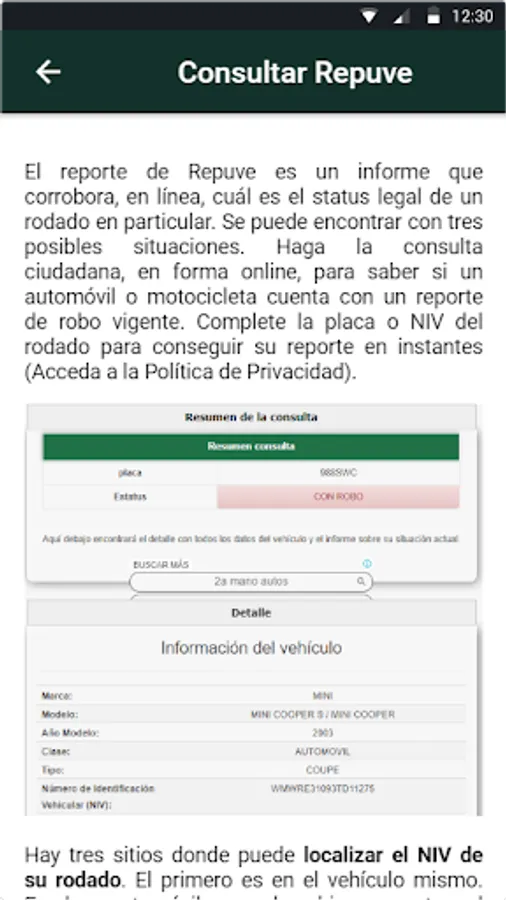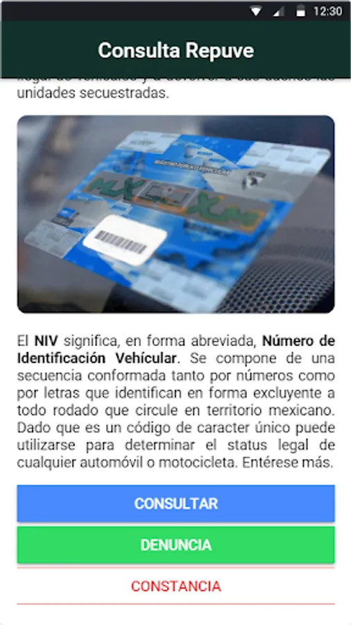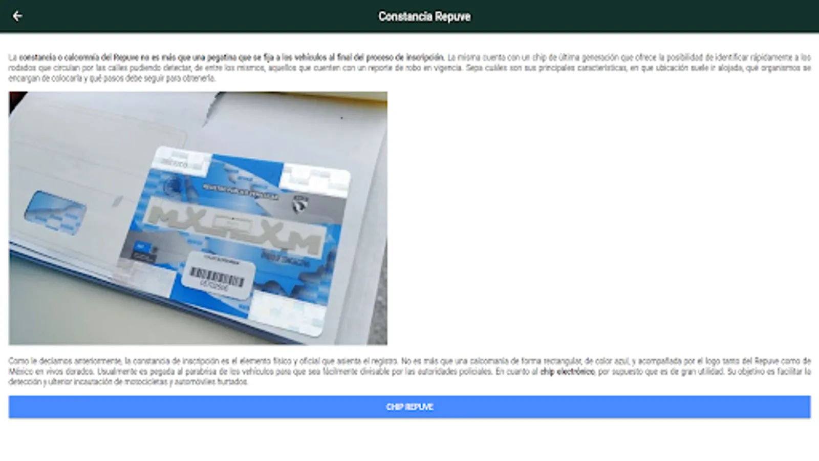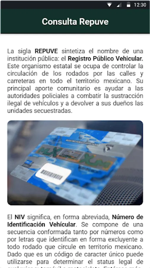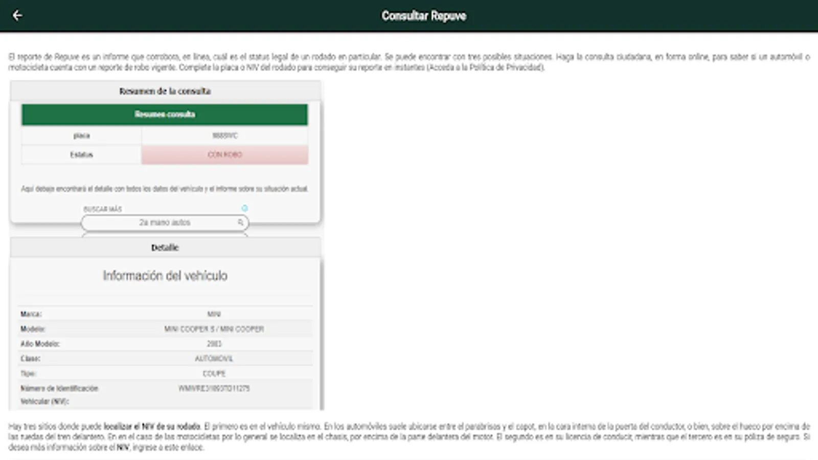 Disclaimer: This application has no relationship with any governmental entity of Mexico or with the Mexican state. The information provided in it is publicly accessible and can be found on the official website of: https://www.gob.mx/sesnsp/acciones-y-programas/registro-publico-vehicular-repuve-168639