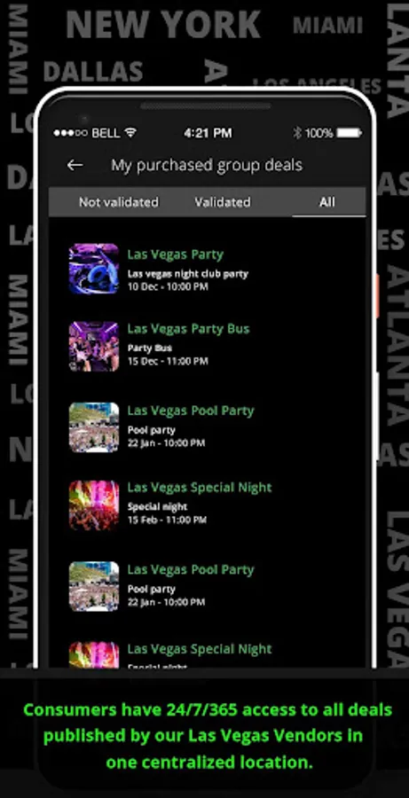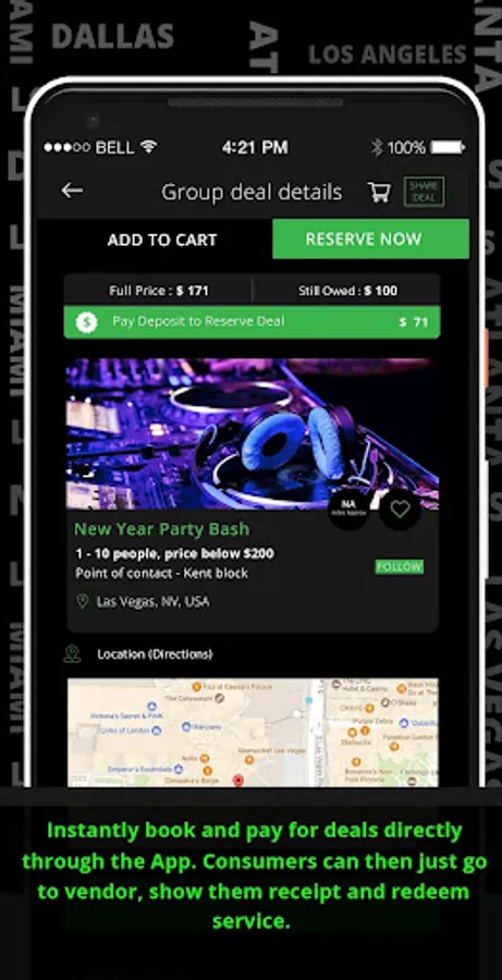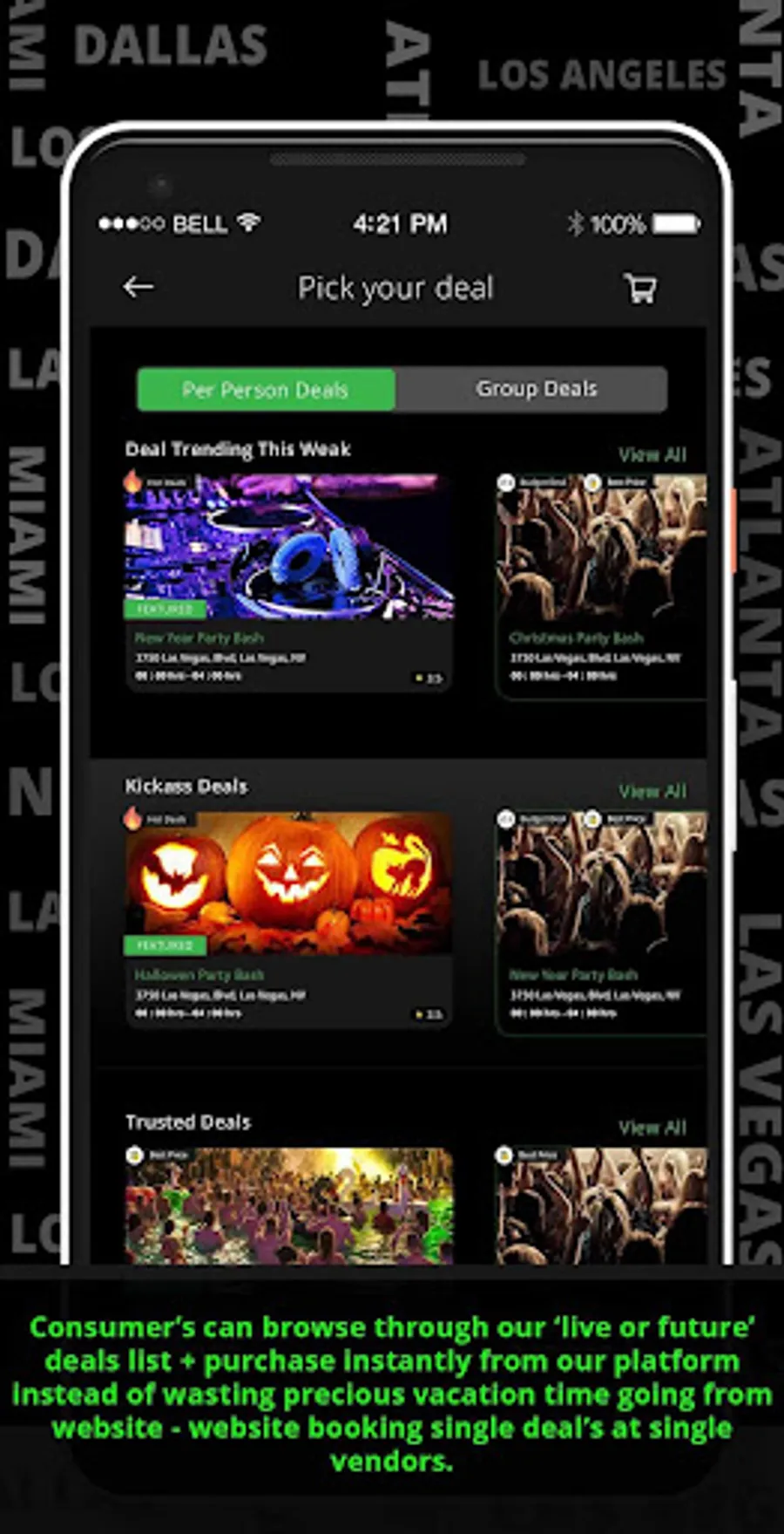 Consumers have 24/7/365 access to all the deals published by vendors from Las Vegas in one centralized location! App users can purchase these ‘live’ or future deals instantly through the App published by the vendors by instantly booking and paying for them directly through the App. App Users can even bundle deals to make their Las Vegas experience specific to exactly what they want!