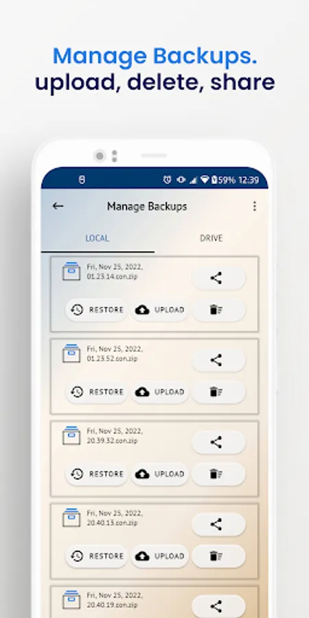 ✓ Click on restore button, the dialog to choose backup file from storage and drive will appear, tap on any backup file, it will start the restore process.