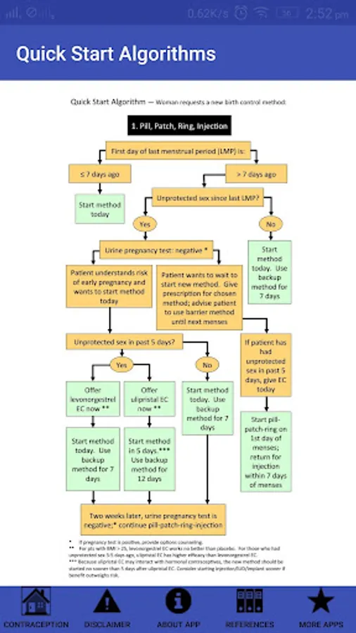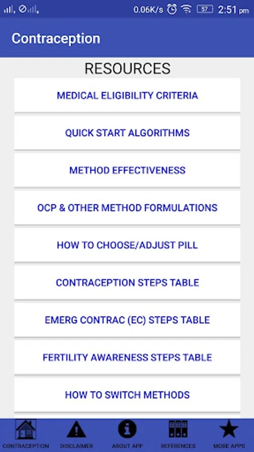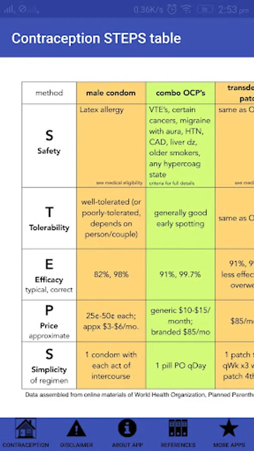 As the home screen screenshot shows, the resources in this app are: Medical Eligibility Criteria (contraindications) reference table, Quick Start Algorithms, table of Method Effectiveness, table of all OCP Formulations on the market and other non-pill hormonal formulations, guidance on How to Choose & Adjust OCP doses, STEPS criteria (safety, tolerability, efficacy, price, simplicity of regimen) for ALL contraceptive methods, focused STEPS comparative table for fertility awareness methods, focused STEPS comparative table for Emergency Contraception methods, guidance on how to switch methods, and a table of necessary exams and testing (prerequisites) before giving contraception.