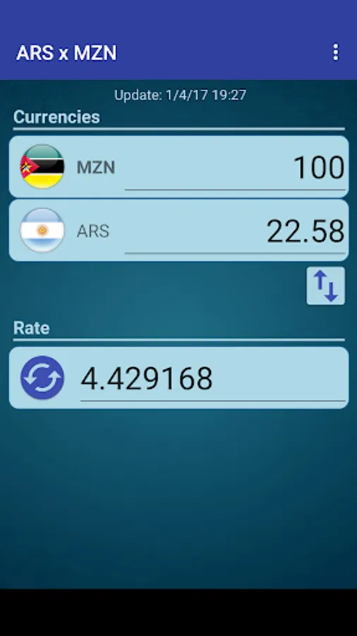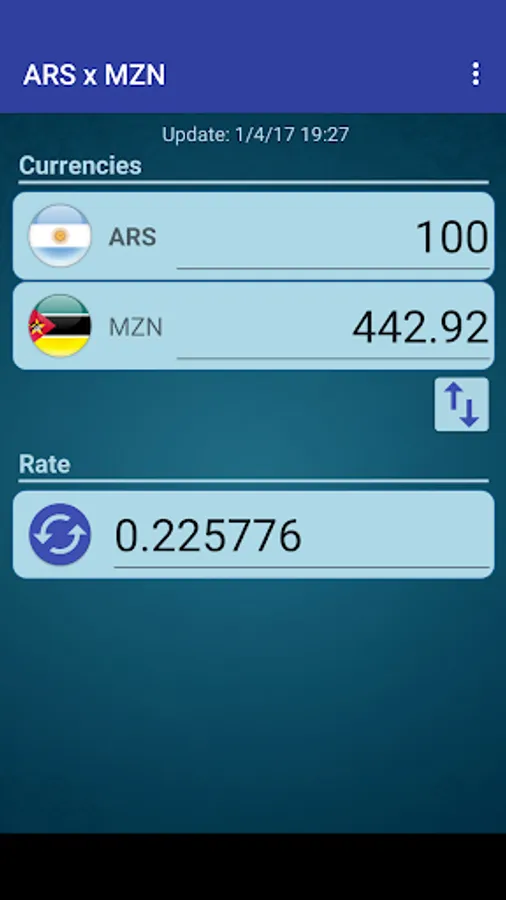 A simple currency converter from Argentine Peso to Mozambique Metical and from Mozambique Metical to Argentine Peso.