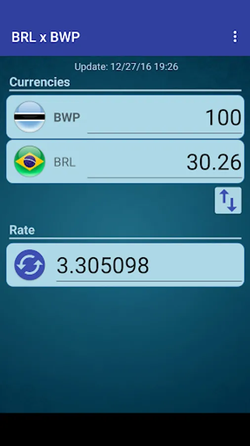 A simple currency converter from Brazilian Real to Botswanan Pula and from Botswanan Pula to Brazilian Real.