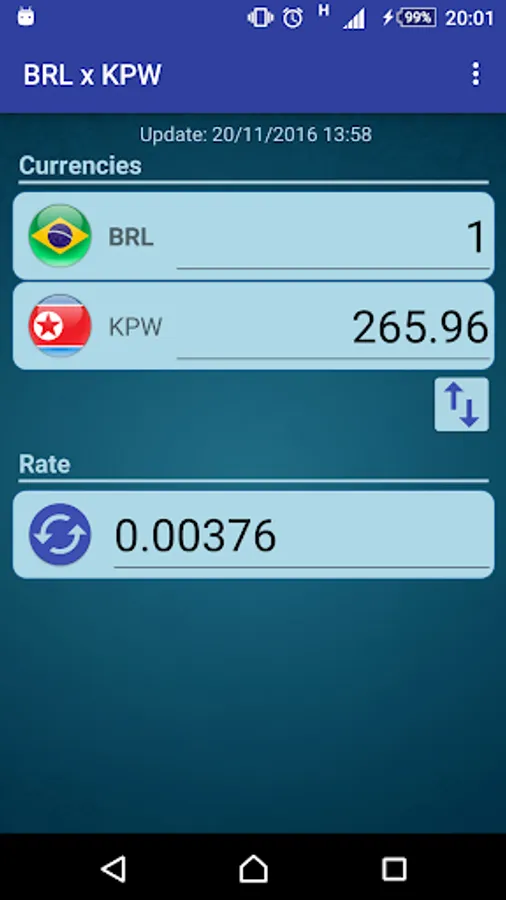 A simple currency converter from Brazilian Real to North Korean Won and from North Korean Won to Brazilian Real.