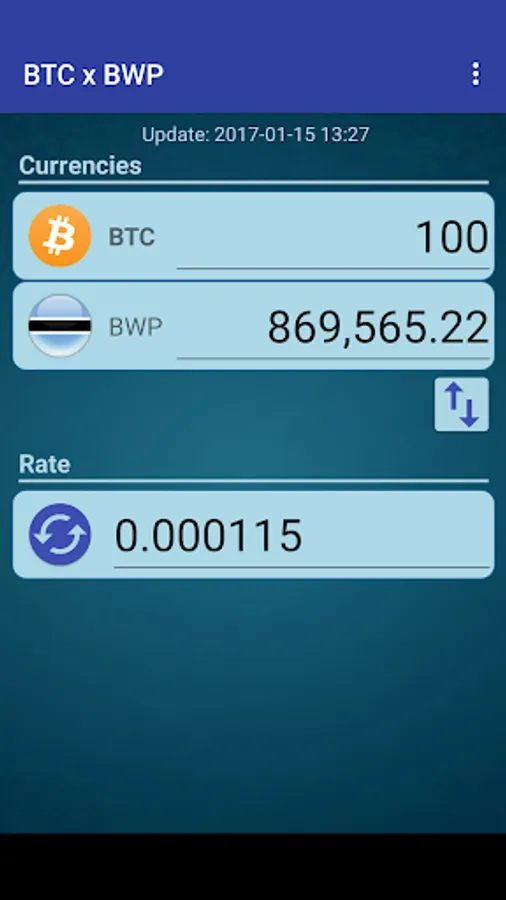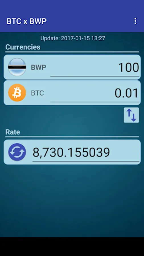 A simple currency converter from Bitcoin to Botswanan Pula and from Botswanan Pula to Bitcoin.