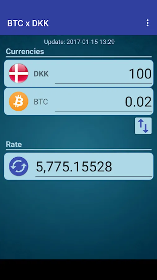 A simple currency converter from Bitcoin to Danish Krone and from Danish Krone to Bitcoin.