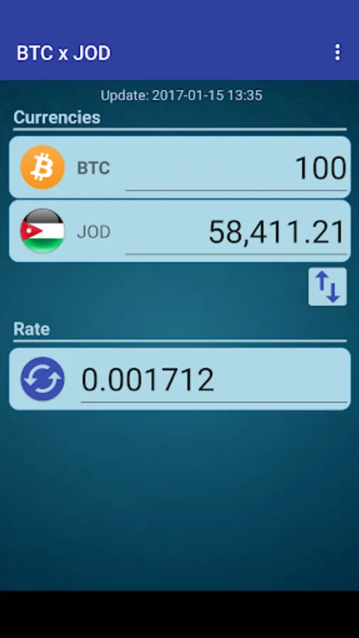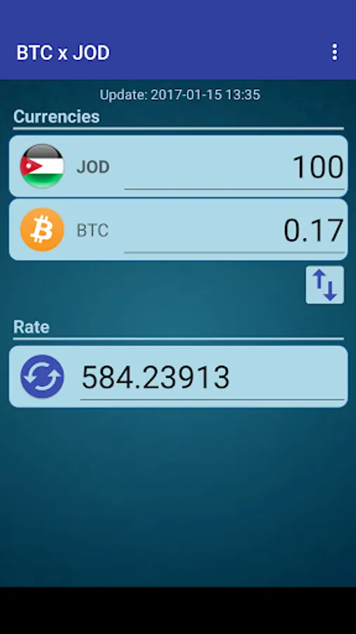 A simple currency converter from Bitcoin to Jordanian Dinar and from Jordanian Dinar to Bitcoin.