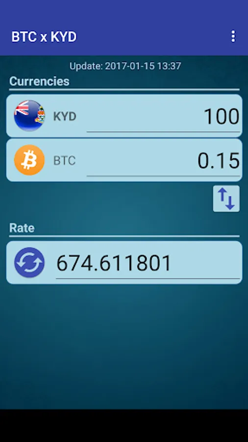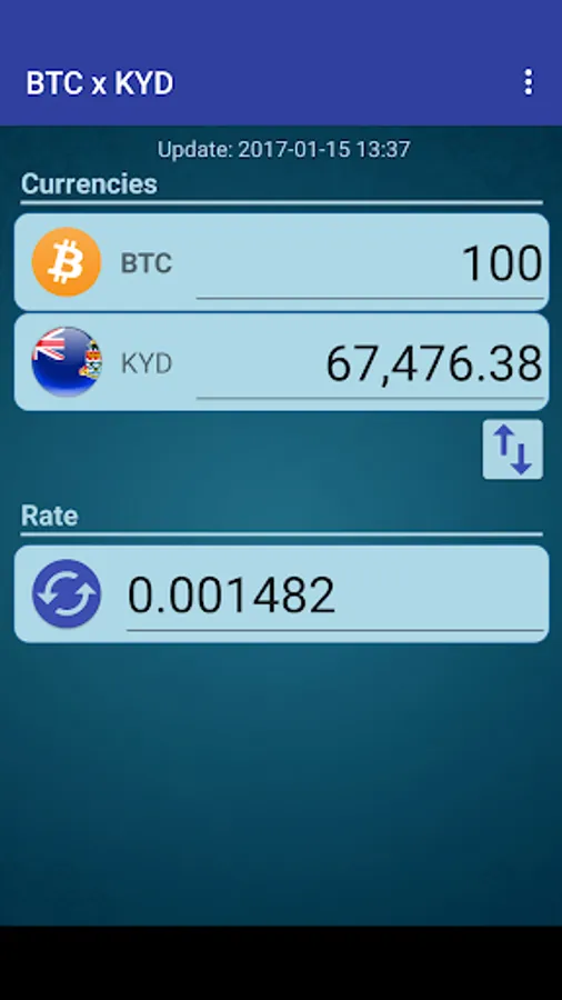 A simple currency converter from Bitcoin to Cayman Islands Dollar and from Cayman Islands Dollar to Bitcoin.