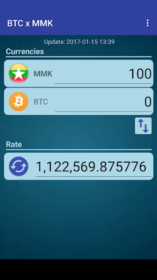 A simple currency converter from Bitcoin to Myanmar Kyat and from Myanmar Kyat to Bitcoin.
