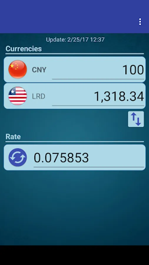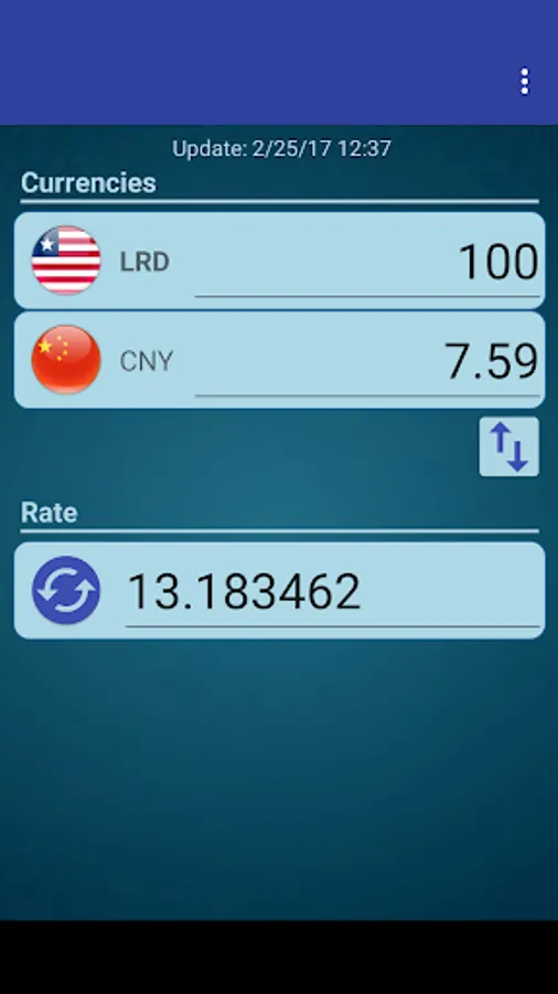 A simple currency converter from Chinese Yuan to Liberian Dollar and from Liberian Dollar to Chinese Yuan.