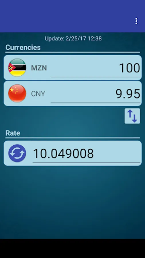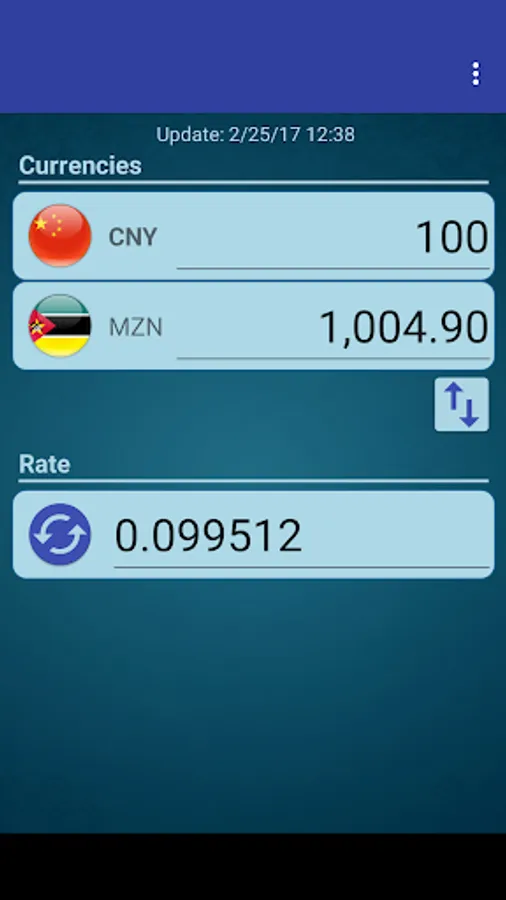 A simple currency converter from Chinese Yuan to Mozambique Metical and from Mozambique Metical to Chinese Yuan.