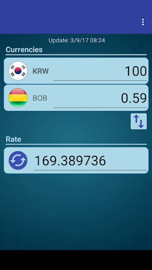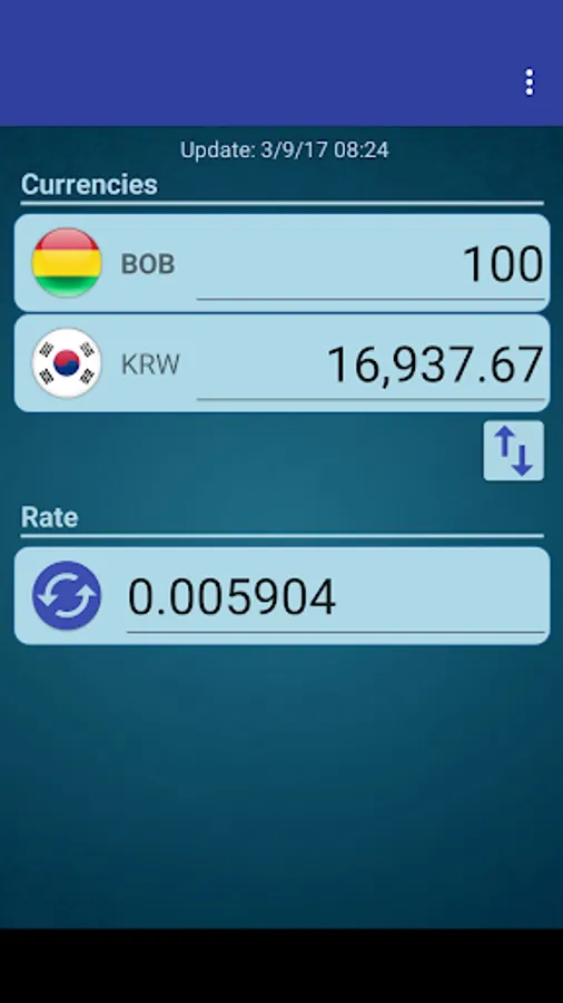 A simple currency converter from South Korean Won to Bolivian Boliviano and from Bolivian Boliviano to South Korean Won.