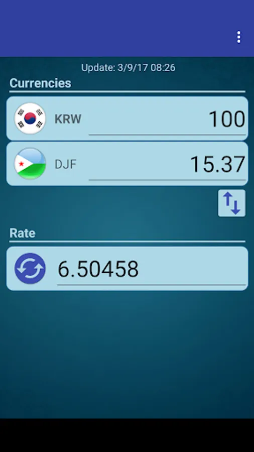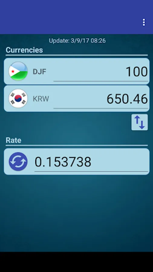 A simple currency converter from South Korean Won to Djiboutian Franc and from Djiboutian Franc to South Korean Won.