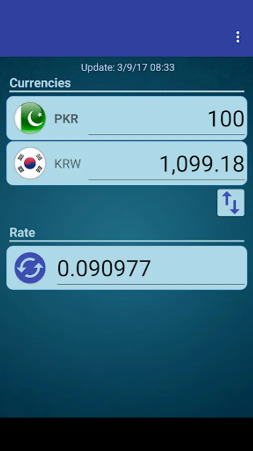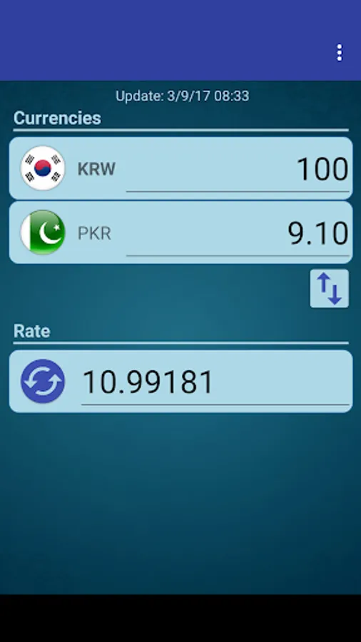A simple currency converter from South Korean Won to Pakistan Rupee and from Pakistan Rupee to South Korean Won.
