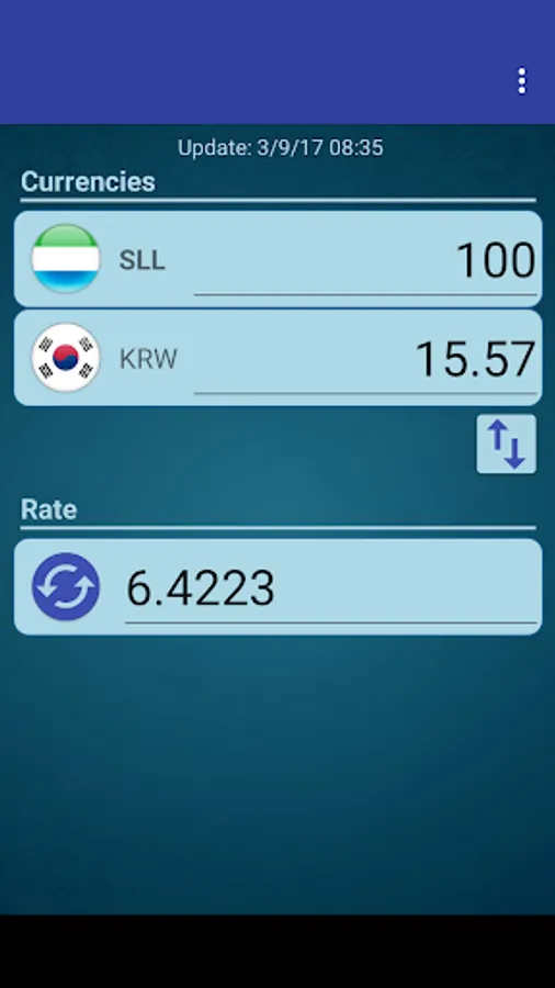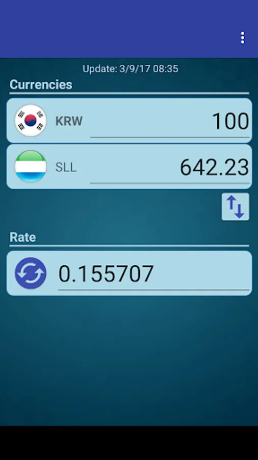 A simple currency converter from South Korean Won to Sierra Leonean Leone and from Sierra Leonean Leone to South Korean Won.