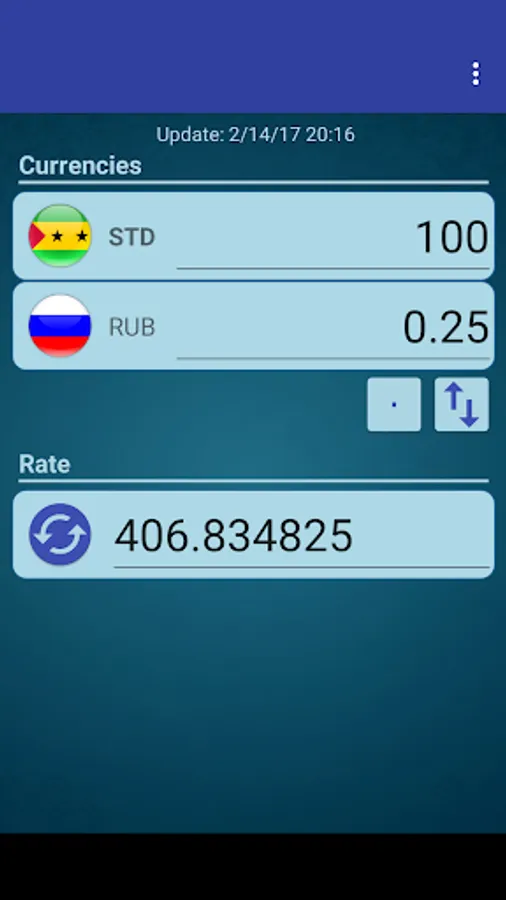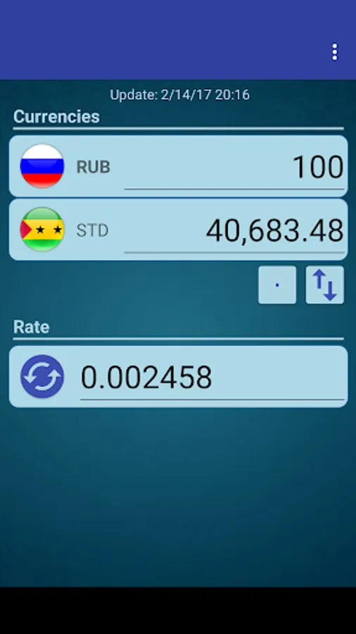 A simple currency converter from Russian Ruble to Sao Tomean Dobra and from Sao Tomean Dobra to Russian Ruble.