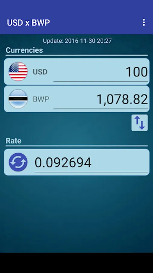 A simple currency converter from United States Dollar to Botswanan Pula and from Botswanan Pula to United States Dollar.
