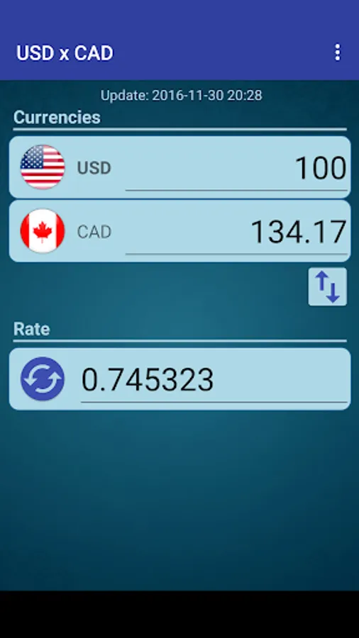 A simple currency converter from United States Dollar to Canadian Dollar and from Canadian Dollar to United States Dollar.