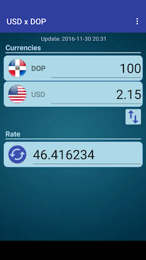 A simple currency converter from United States Dollar to Dominican Peso and from Dominican Peso to United States Dollar.