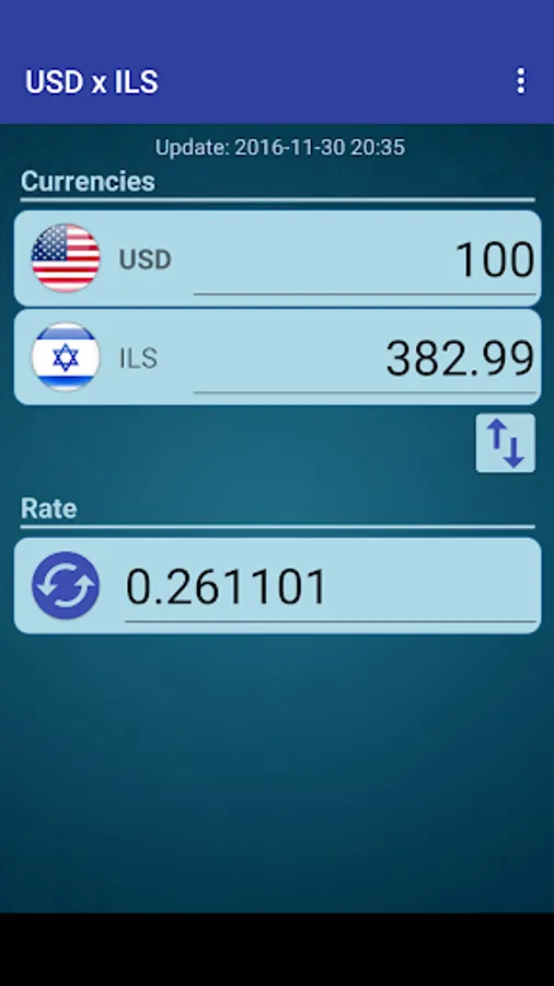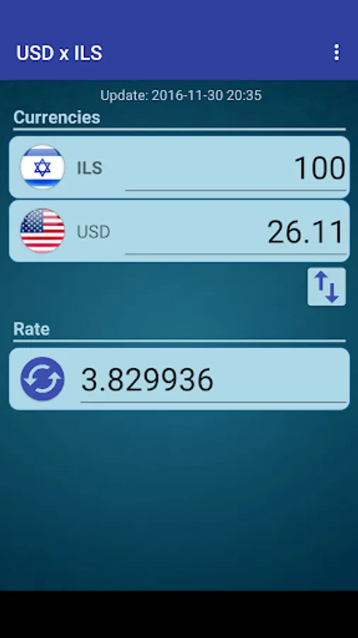 A simple currency converter from United States Dollar to New Israeli Shekel and from New Israeli Shekel to United States Dollar.